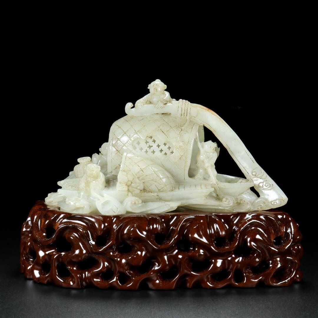 - *珍品旧蔵* 清 玉彫 和田老玉 漁夫得利 漁船 置物 極細工 中国古玩 骨董品 古美味 H410