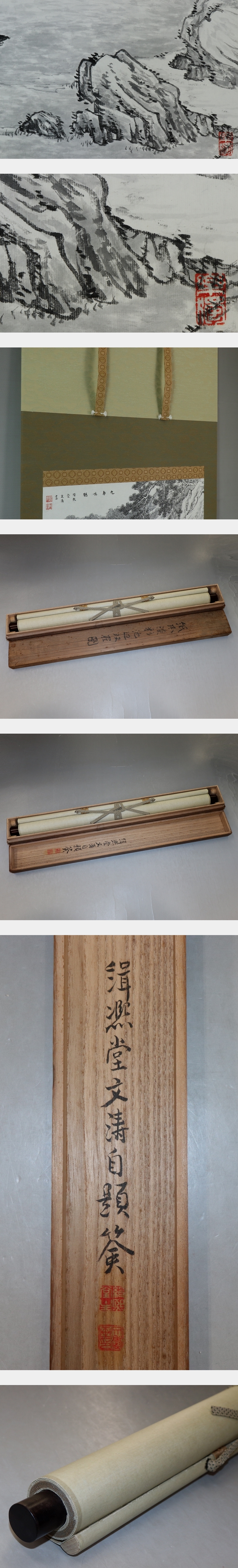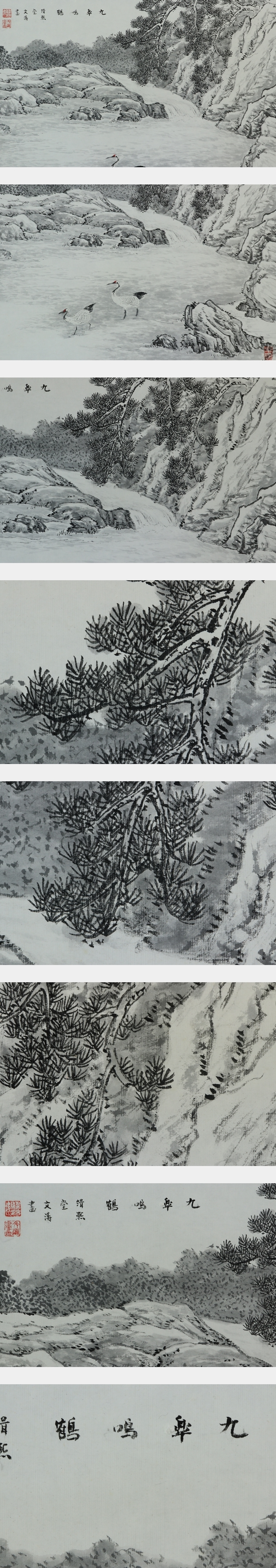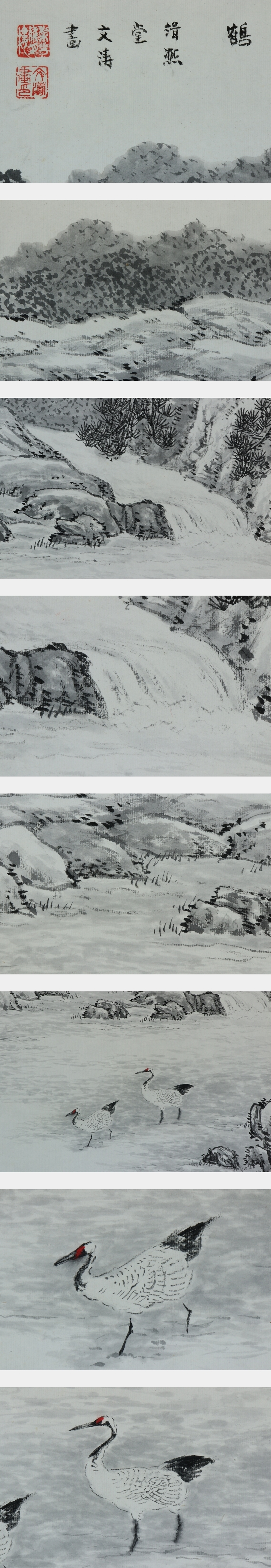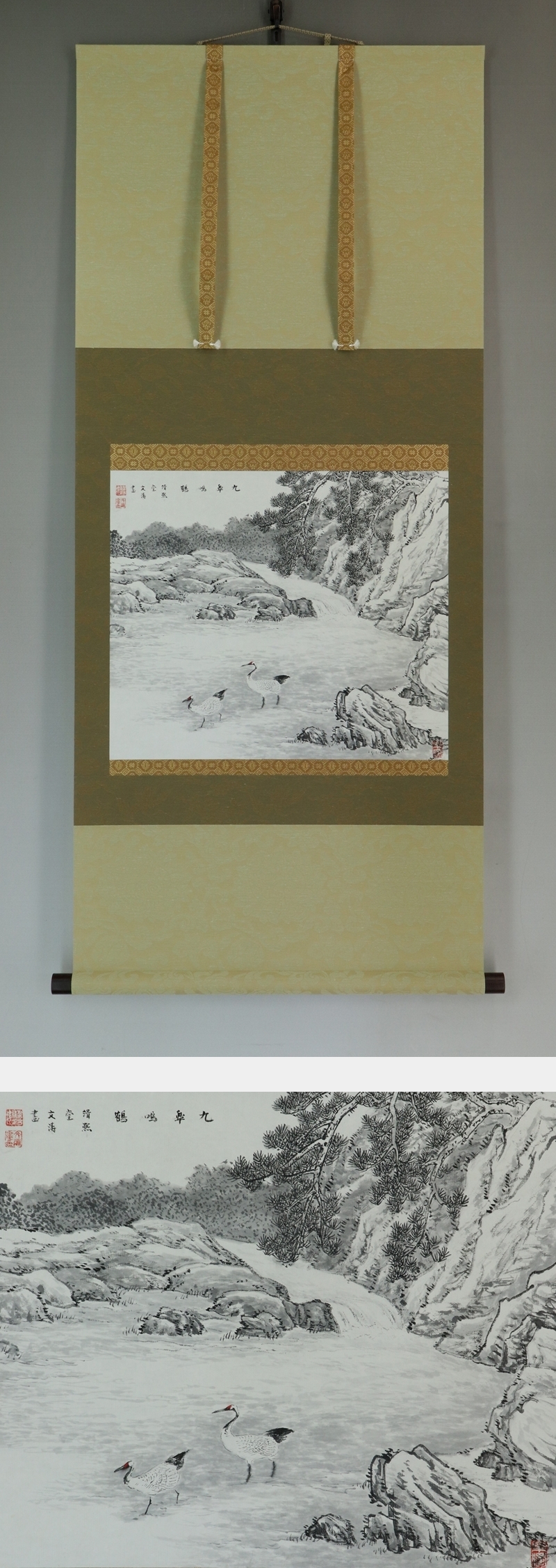 - 【真作】岡文涛【淡彩池辺双鶴図】◆紙本◆共箱◆改装済掛軸 1603015a