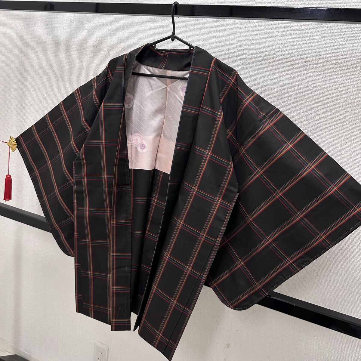 - 格子柄大島紬 羽織 可愛い黒地 着物 正絹 Q-018