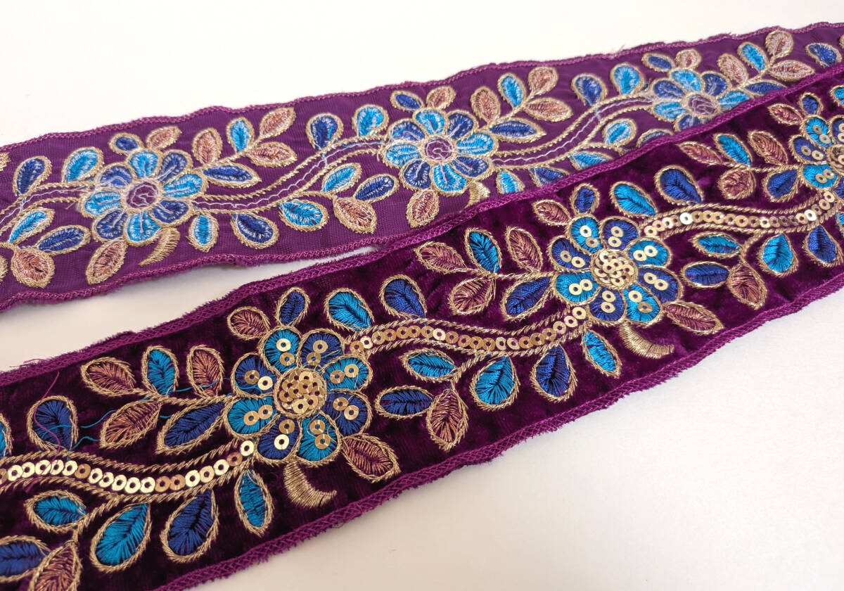 - ブレード 花柄 刺繍 ゴールドスパンコール パープルビロード地 約7x182cm