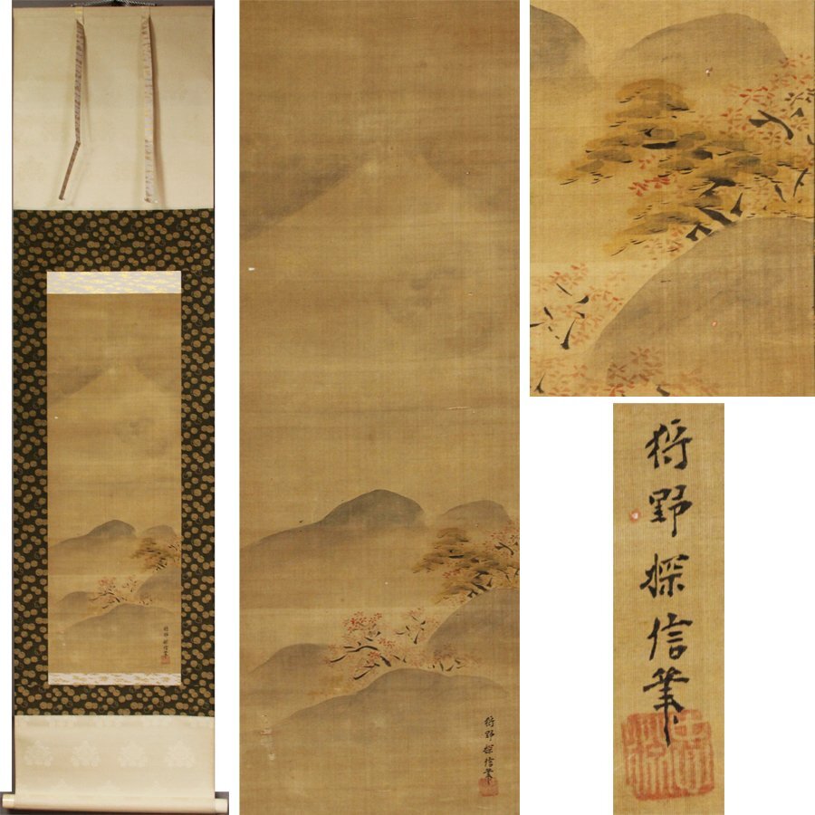 - 《源》【即決・送料無料】《江戸期・古画》狩野探信(守政) 筆「遠望富士・満開桜図」/箱付