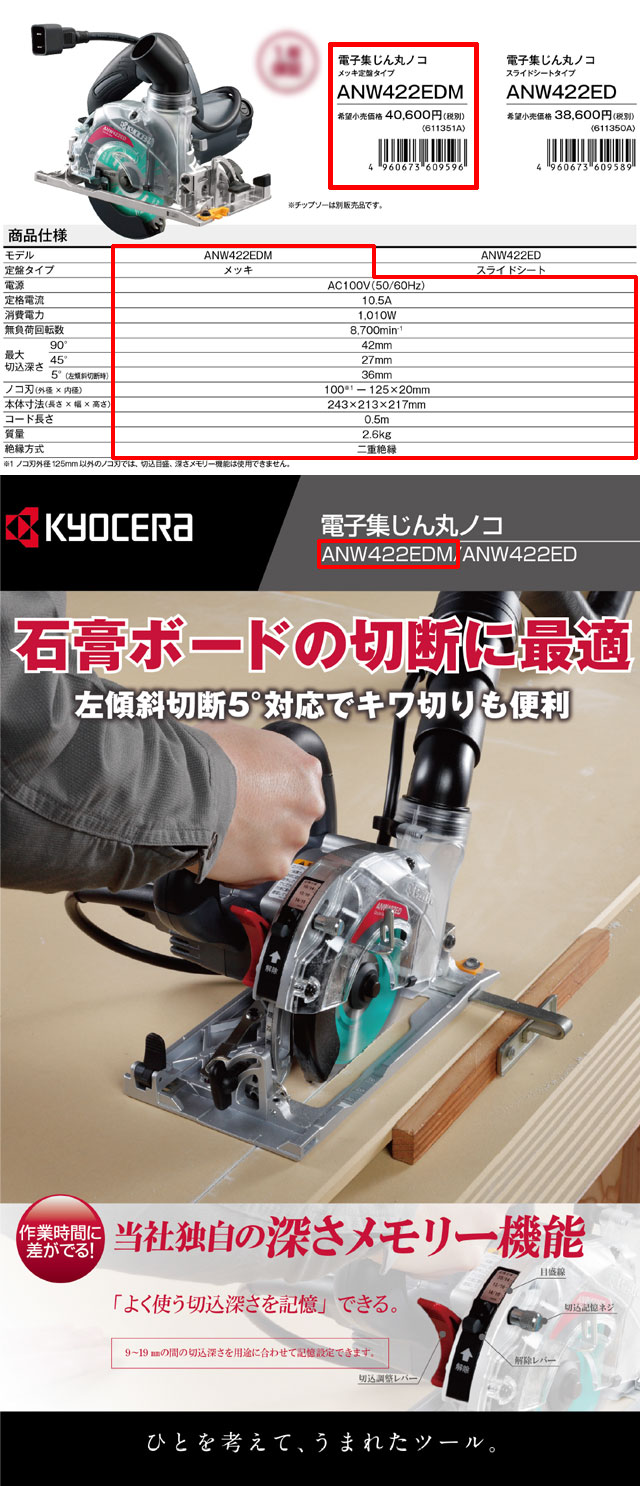 > 京セラ 125mm電子集じん丸のこ ANW422EDM メッキ定盤タイプ 深さメモリー機能 ショートコード仕様 【長野発】