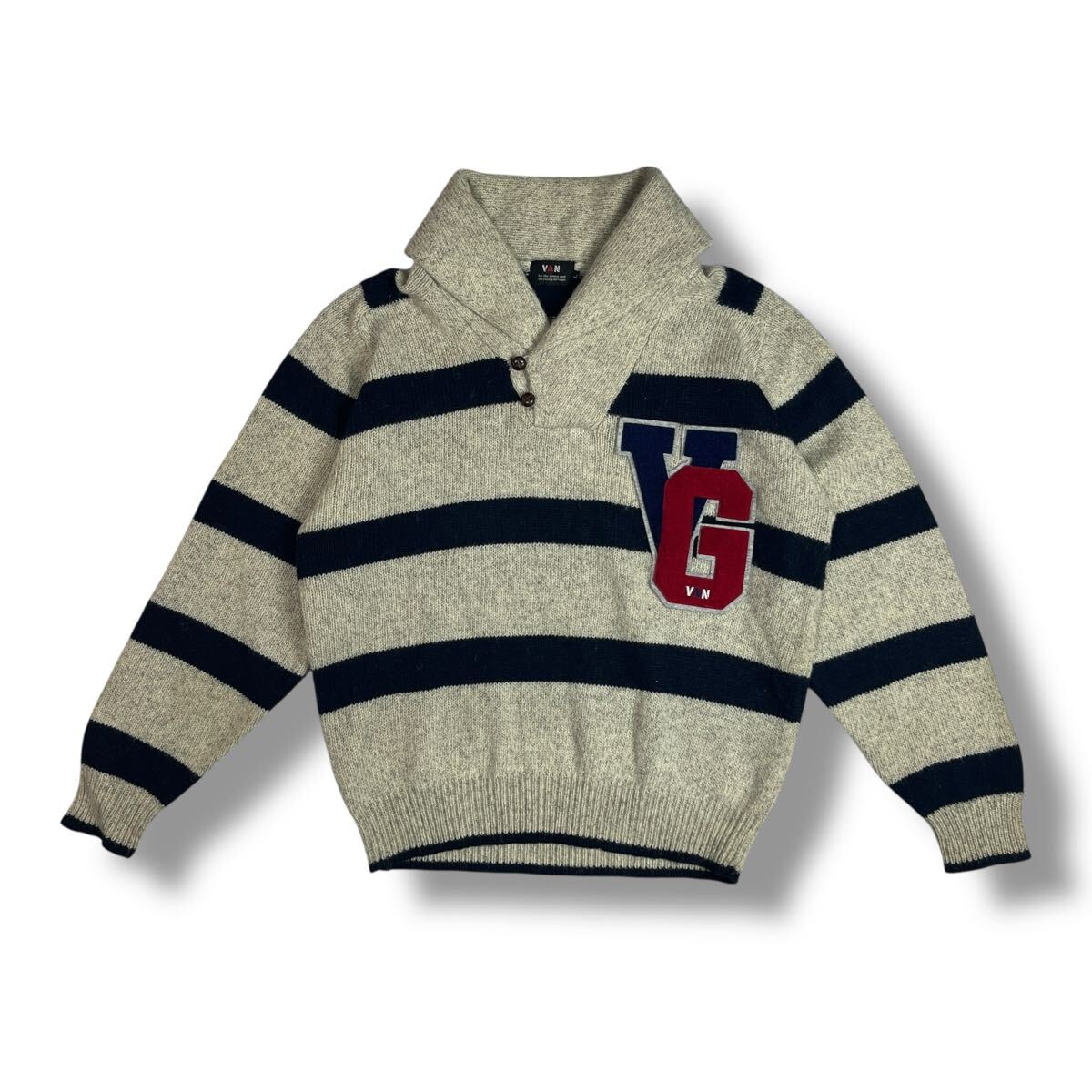 > OK1015 VAN ヴァン ウールカウチンニット レタード ボーダー ラグラン ワンポイントロゴ 刺繍 ホワイト系×ネイビー Lサイズ