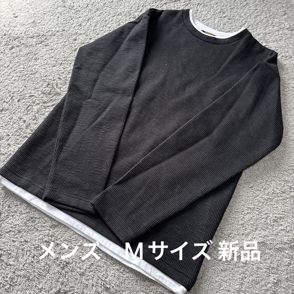 - メンズ 内側ベロア重ね着風ワッフルトレーナー黒M★新品36