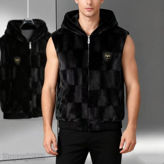 - ファーベスト♪新入荷 メンズ フード付き 毛皮 ベスト フェイクファー 紳士 秋冬 暖か サイズ選択可 黒/3XL