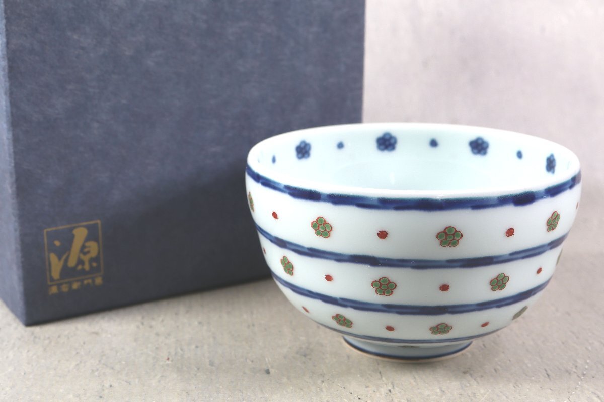 - 未使用 館林源右衛門 源右衛門窯 染錦緑梅小紋割 茶碗 飯碗 梅 有田焼 陶器 食器 箱付き