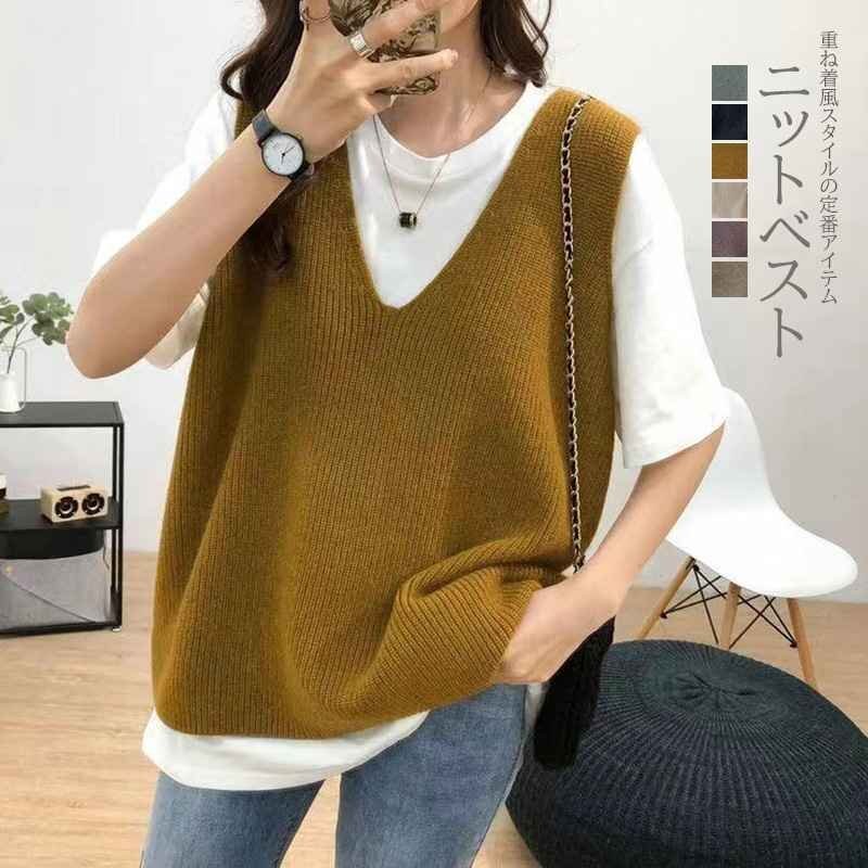 > ニットベスト ジレ レイヤード 重ね着 トップス セーター チュニック Vネック レイヤード 無地 フリー オートミール
