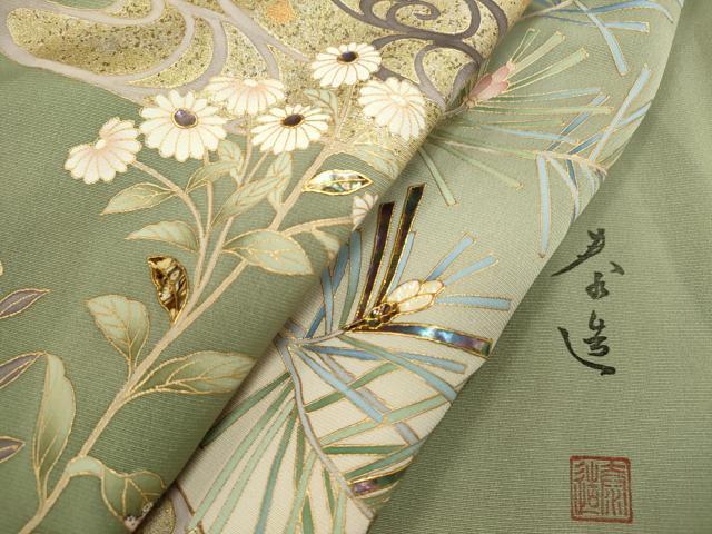 - 平和屋着物▼螺鈿作家 甲斐泰造 訪問着 螺鈿 流水草花文 暈し染め 金銀彩 正絹 逸品 CAAY6124ze