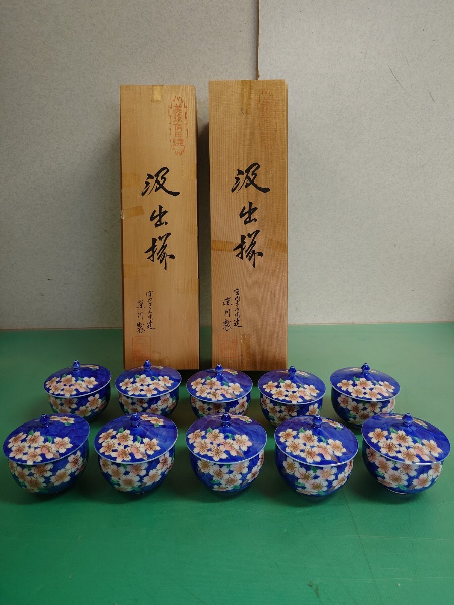 - ● 有田焼 深川謹製 宮内庁御用達 汲出揃 蓋付き 湯呑 10点セット 桜 金彩 深川製磁 深川ブルー 茶器 共箱 美品 ③