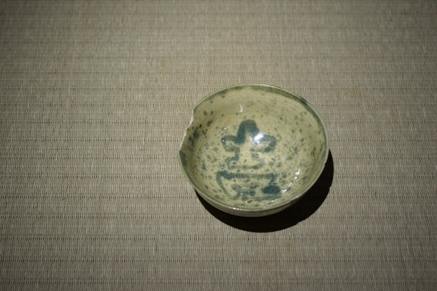 とても珍しい、太白手の吹墨吉字文の盃です。残念ものではありますが、おそらく古染付をオマージュした吹墨に吉字の絵付けはすばらしく、形状も太白手の盃としては凛としたもので、好ましい。吉の字は、いかにも魯山人好みの明快な力強さです。ぜひ、銀直しや白漆直しなどを施して、日々の酒盃に加えてくださればと思います。