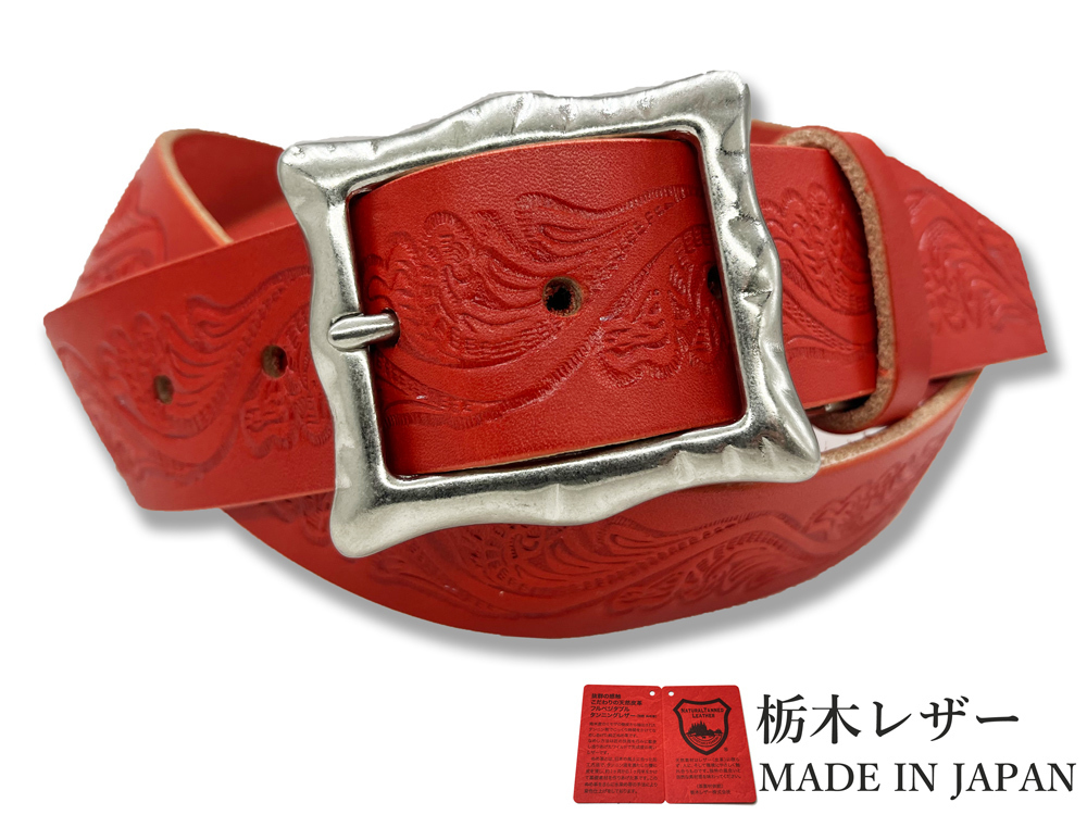 - 新品 栃木レザーベルト Mサイズ 型押し クラフト 40mm 本革 牛革 メンズ レディース 国産 レザー カジュアル 赤色 レッド w072-M-RD
