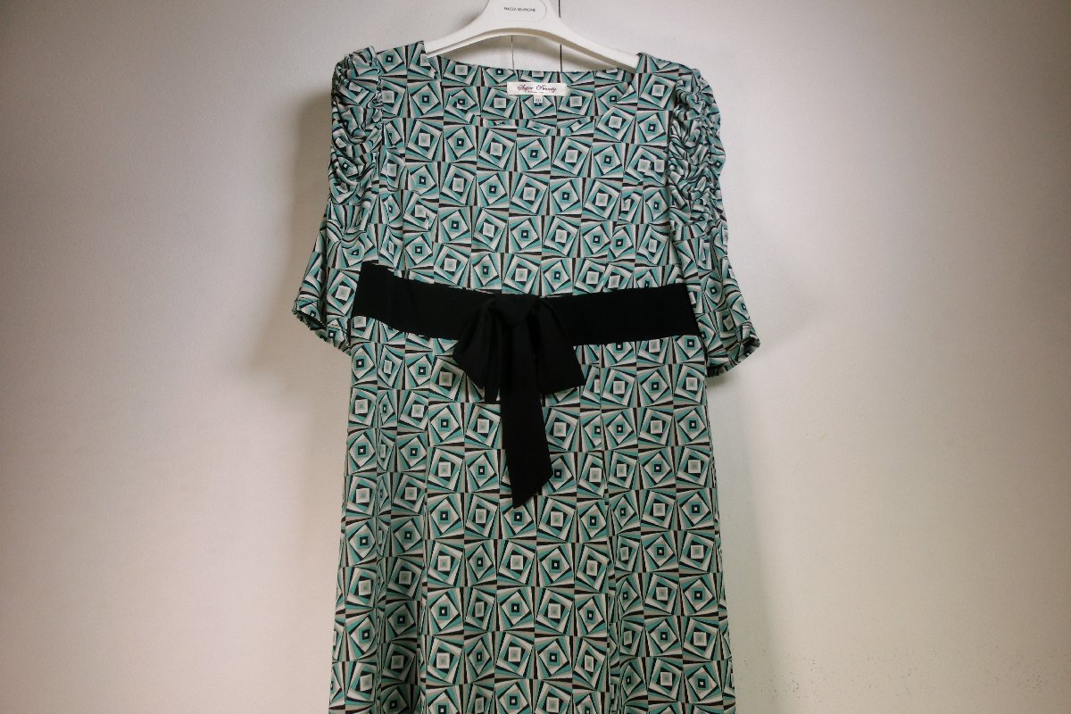 > ♪美品 試着のみ!★Super Beauty/スーパービューティ(40)★グリーン×黒スクエア柄幾何学模様ウエストリボン半袖ワンピース