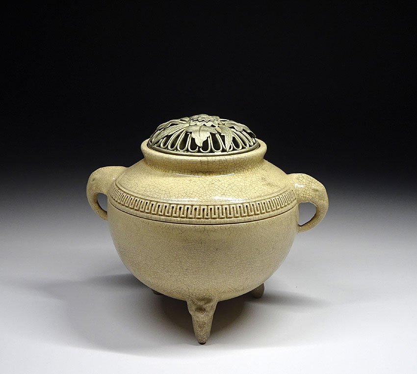 - 緑屋k■ 時代物 薩摩焼 陰刻 双耳 香炉 透かし菊花彫火屋 古陶磁 i9/10-6021/21-2#80