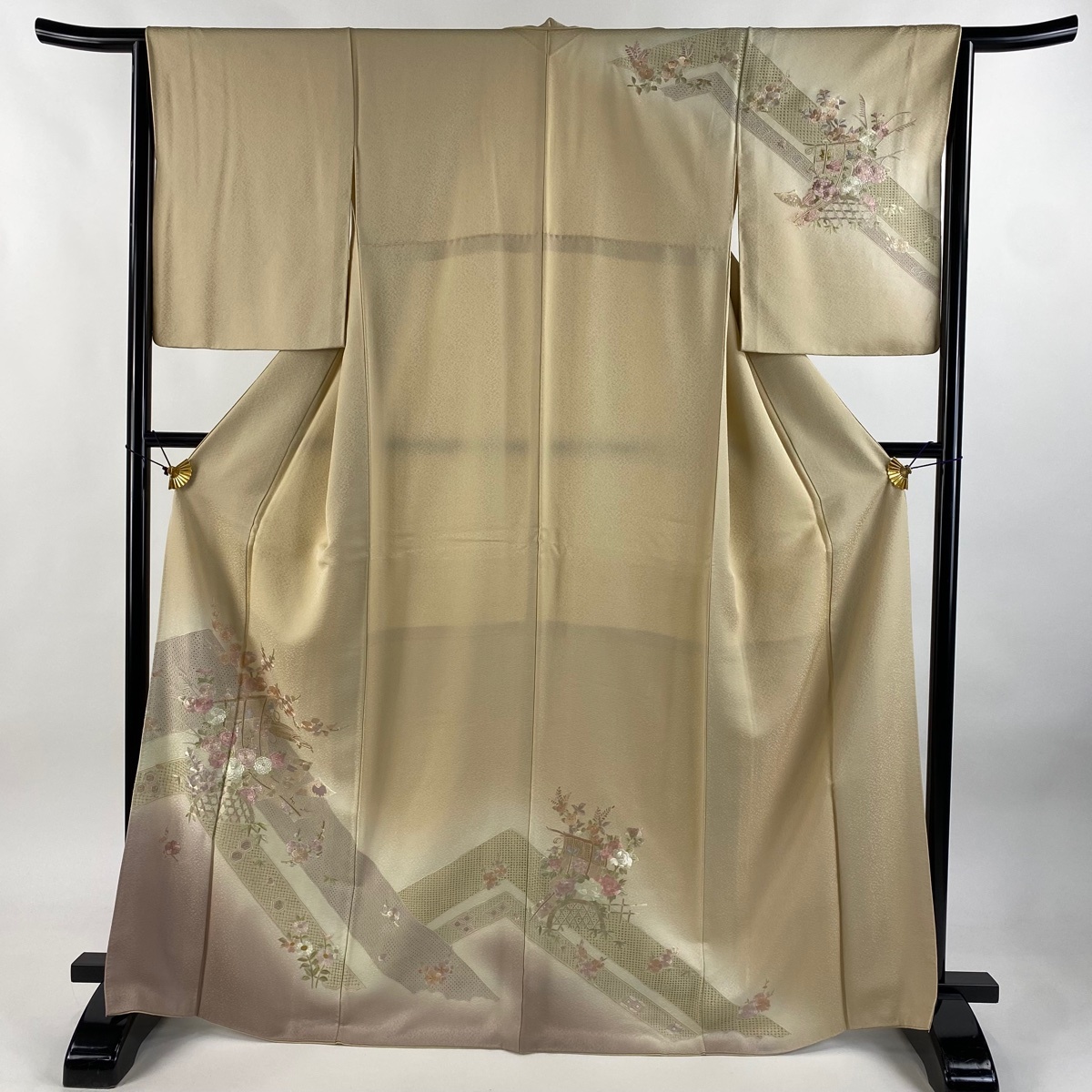 > 【美品】 訪問着 身丈167cm 裄丈63.5cm S 袷 几帳 草花 刺繍 ぼかし ベージュ 正絹 名品 【中古】