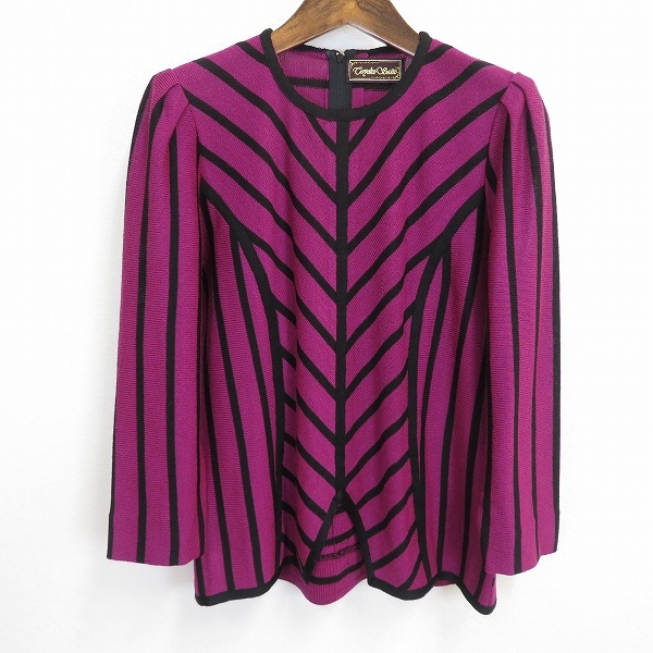 > #a サイトウトヨコ 斉藤都世子 ニット セーター 赤紫 黒 七分袖 切替ストライプ トップス カットソー レディース [963081] k01