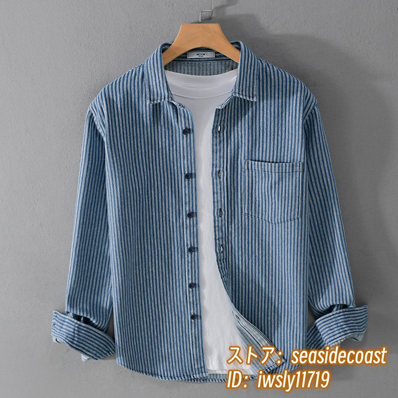 - 新品 メンズシャツ 長袖シャツ ストライプ柄 ヴィンテージ 春夏 ウォッシュ スリム 心地良し カジュアル 紳士服 トップス 細身 ブルー 3XL