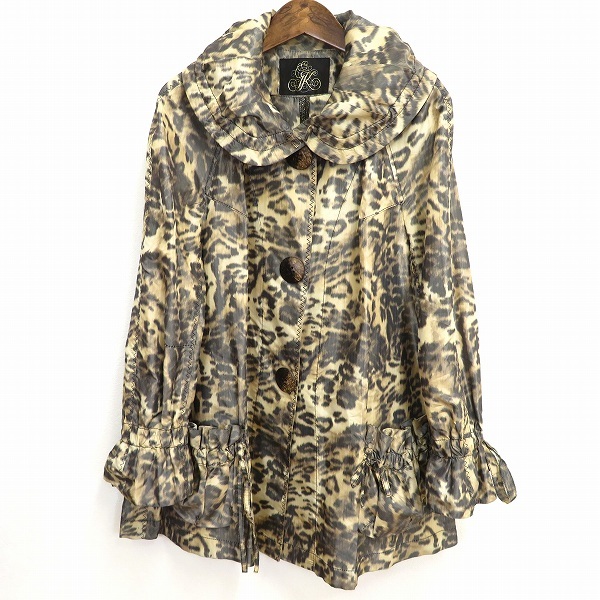 > #a 伊太利屋 GK ITALIYA イタリヤ コート 9 ベージュ 黒 茶系 ヒョウ柄 アニマル柄 丸襟 スナップボタン 美品 レディース [963076] k01