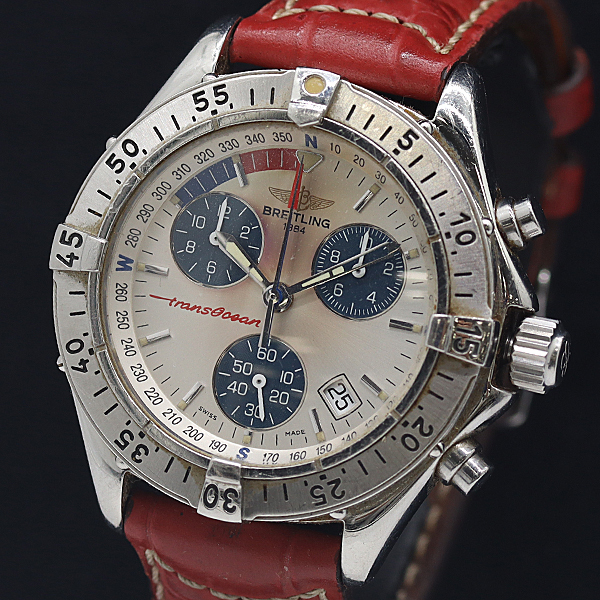 > 1円 箱付 稼働 ブライトリング A53040.1 トランスオーシャンクロノグラフ 2989 QZ シルバー文字盤 メンズ腕時計 8443600 10KHT KTU