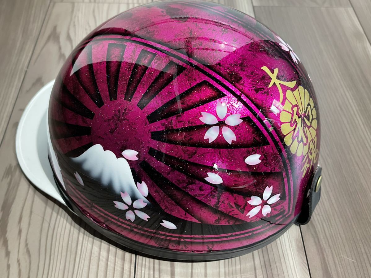 - 三つボタン 七色ラメ 桜 ラップ塗装 富士日章 コルク半 ヘルメット 旧車會 暴走族 アルフィン 三段シート ロケットカウル 短風防 旭風防