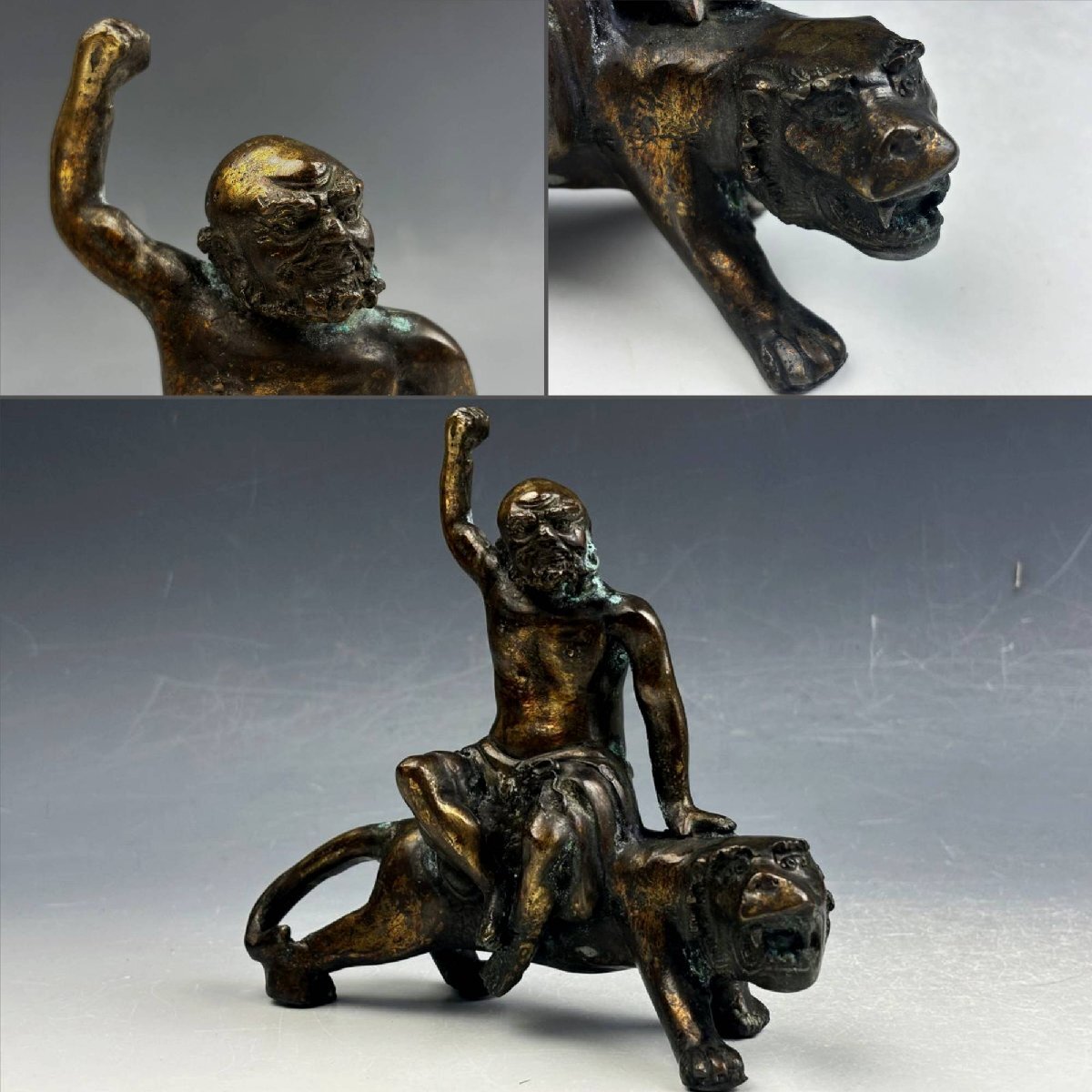 - 中国古玩 古銅 鋳銅 鍍金 伏虎羅漢像 虎仙人像 仏像 置物 626g 仏教美術 仏具 茶道具 唐物 時代物 金工品 古美術骨董品 SGS112【遅日亭】