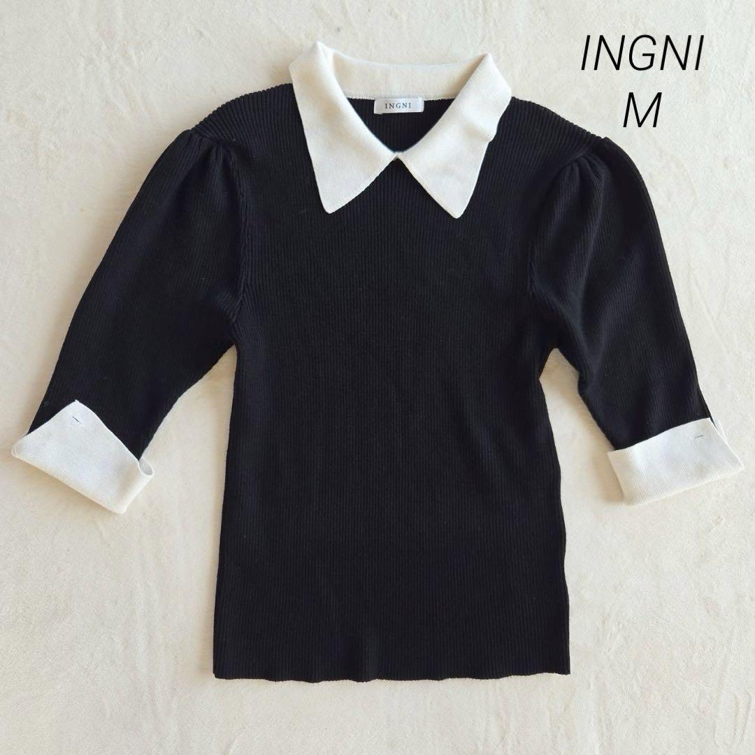 - イング INGNI ニット M 七分袖 襟付き ブラック×ホワイト