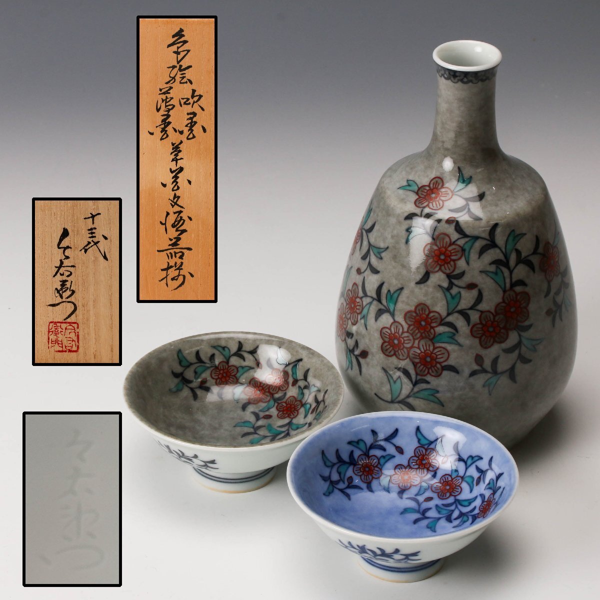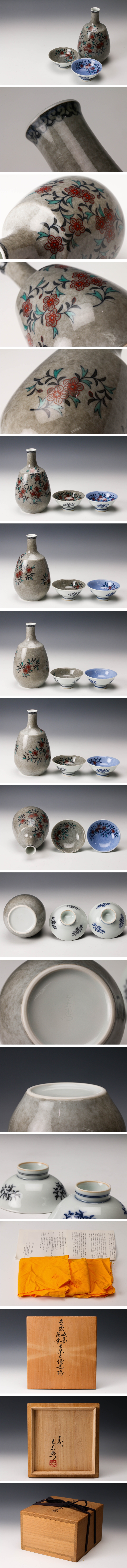 > 【佳香】人間国宝 十三代 今泉今右衛門 本人作 色絵吹墨薄墨草花文酒器揃 徳利 盃 二客 共箱 共布 栞 本物保証