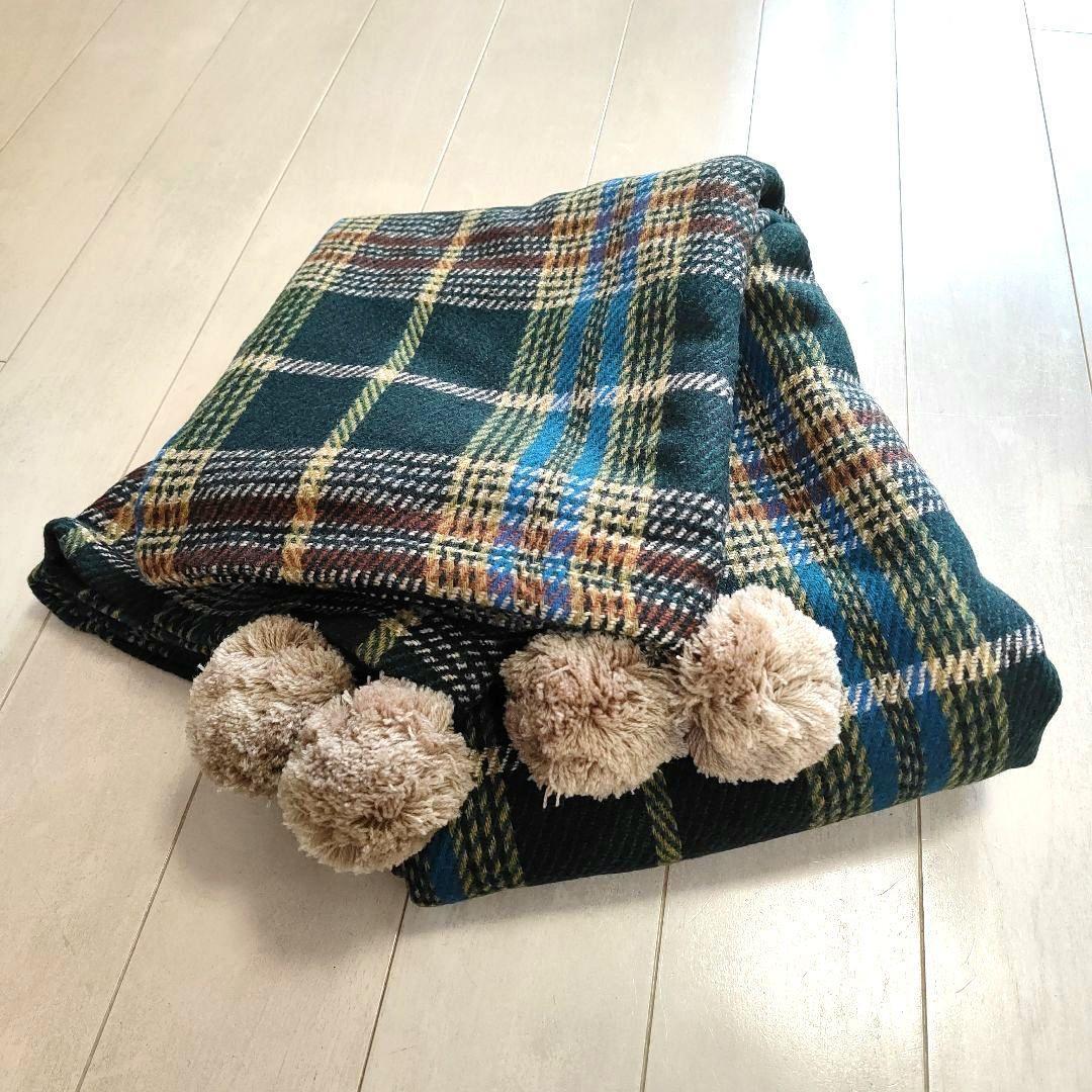 - ピアノカバー タータンチェック柄 Xmasグリーン 毛糸のぼんぼり140×200