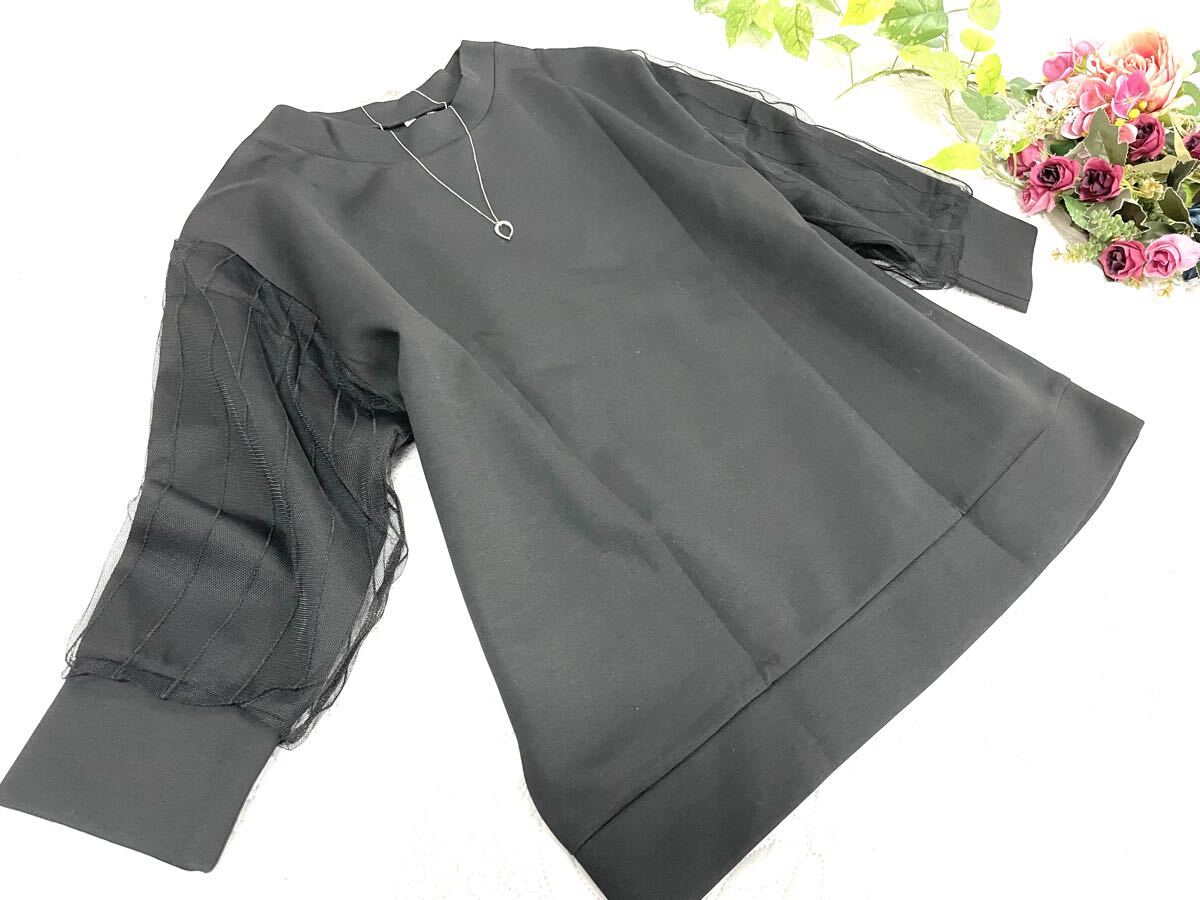> f■3L■新品■きれいめカジュアル*ドロップショルダー二の腕ゆったり*袖チュール異素材ルオーバーTops*綺麗シルエット■黒