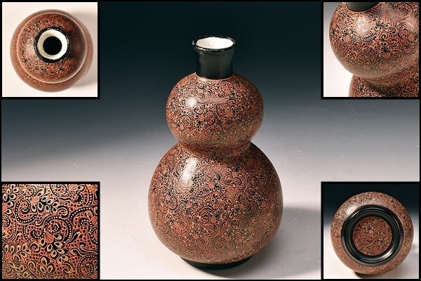 - SP4940 陶漆 蒟醤 キンマ 細密 瓢瓶 徳利 酒器 酒次 酒注 花入 花器 壷 陶胎漆器 磁胎漆器