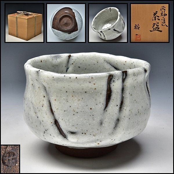 - SP6298 猪飼祐一 灰釉 白流 茶碗 茶器 茶道具 共箱