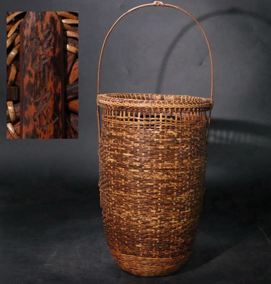 - 上手 在銘 昭竹斎 作 斑竹 竹編 竹籠花入 / 茶道具 煎茶道具 花生け 籠 .B1262