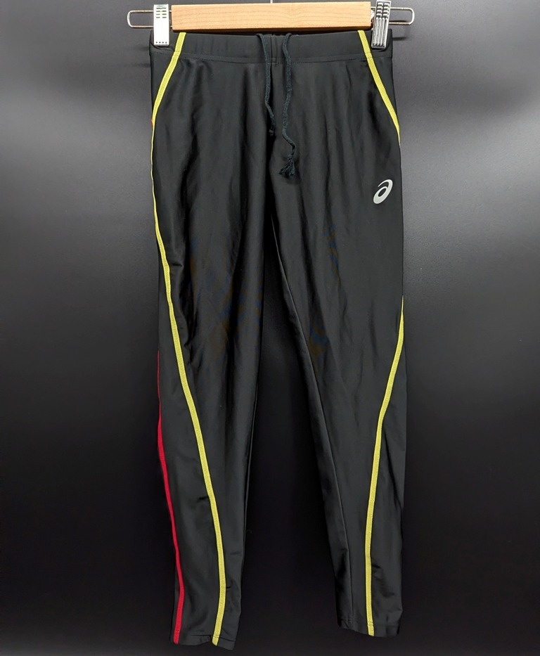 - 4734C 送料185円♪ asics アシックス XT7214 光沢 ブラック 赤 黄ライン レディース ロング レーシングタイツ Sサイズ