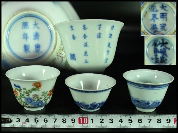 - 【金閣】煎茶 唐物 中国美術 染付 色絵 碗 三個 まとめて 旧家蔵出 送料無料(XA860)