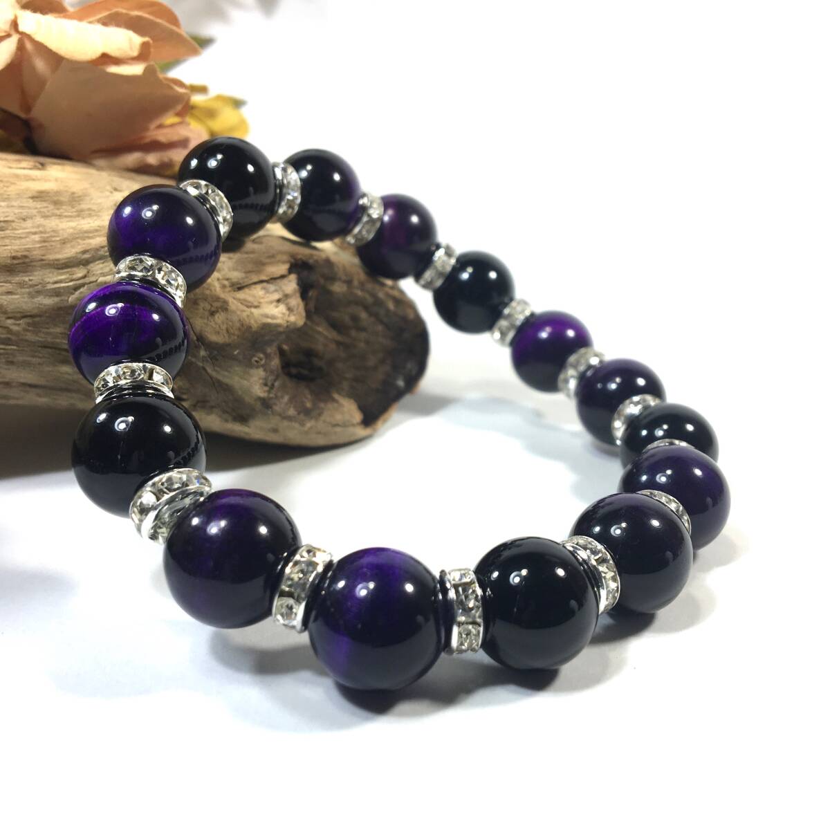 - パープルタイガーアイ&オニキス パワーストーン ブレスレット 天然石ブレス (シルバー) 12mm 幸運 開運 メンズ 男性♪
