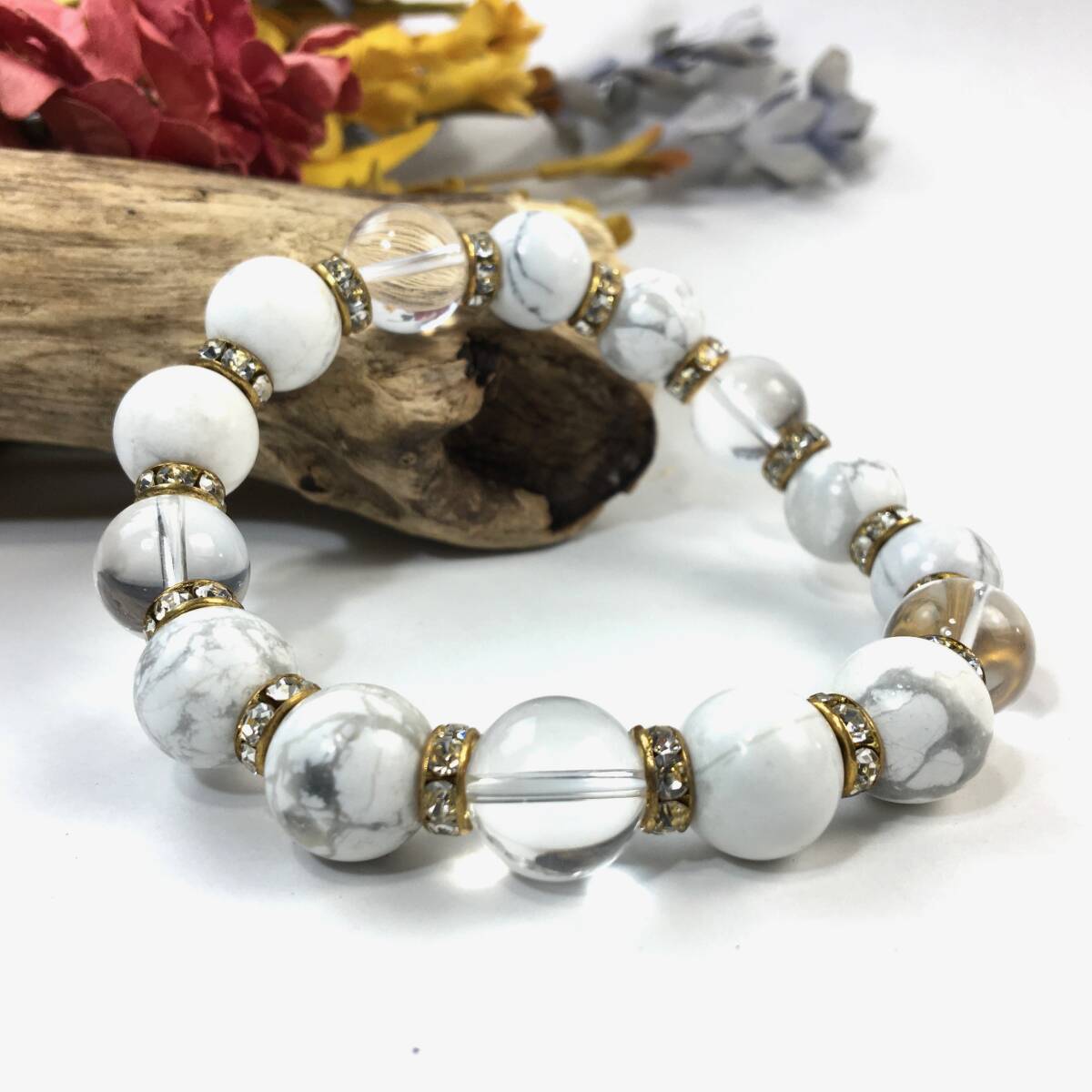 - ハウライト&水晶 パワーストーン ブレスレット 天然石ブレス (ゴールド) 12mm 幸運 開運 メンズ 男性♪