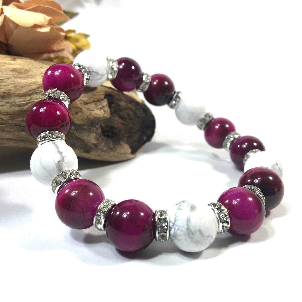 - ピンクタイガーアイ&ハウライト パワーストーン ブレスレット 天然石ブレス (シルバー) 12mm 幸運 開運 メンズ 男性♪