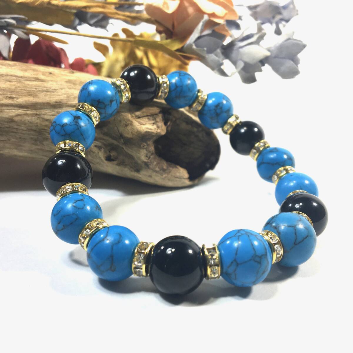- ターコイズ&オニキス パワーストーン ブレスレット (ゴールド) 12mm 幸運 開運 メンズ 男性♪