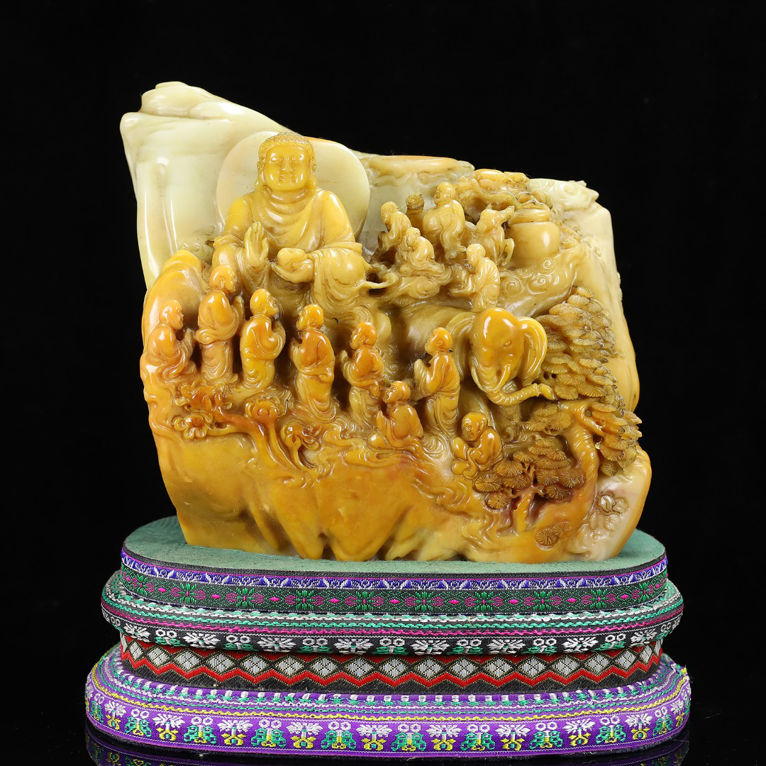 - ▽鴻▽清朝時代 寿山石 田黄石彫 万仏朝宗置物 汝糞作 箱付 時代物 中国古美術 骨董品