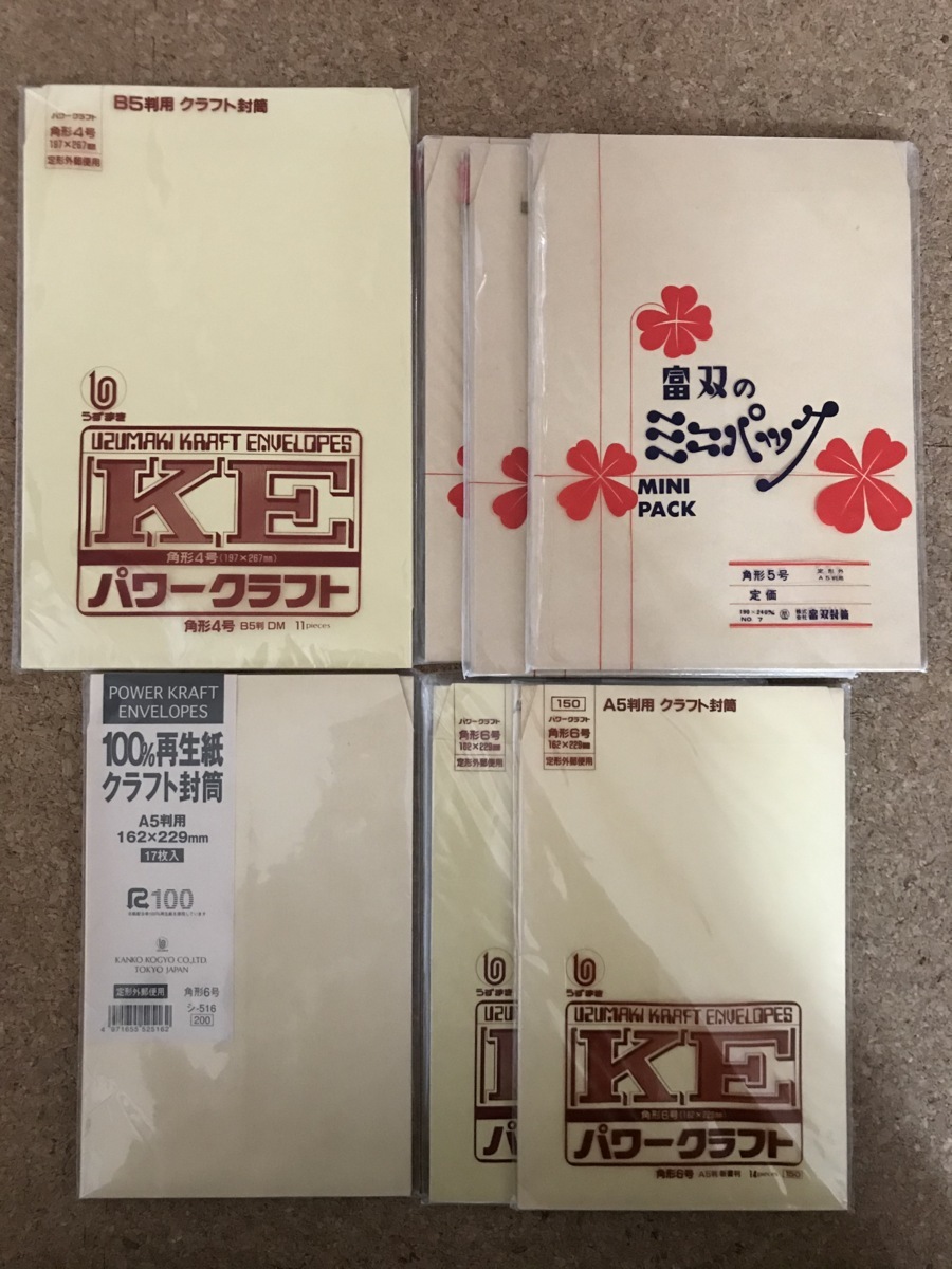 - [ 茶封筒] うずまき クラフト封筒 角形4号+角形6号/ 富双ミニパック 角形5号 13枚入/ 菅公 角形6号 17枚入 4種7点 送料無料 B-133