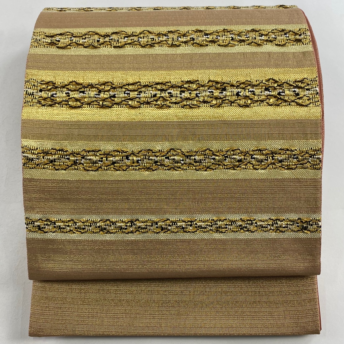 - 【美品】 袋帯 秀品 段縞 幾何学 金糸 箔 薄茶色 お太鼓柄 正絹 【中古】