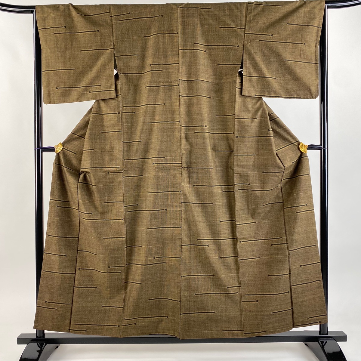 - 【美品】 大島紬 身丈157cm 裄丈65.5cm M 袷 純泥染 証紙 縞 幾何学 茶色 正絹 秀品 【中古】