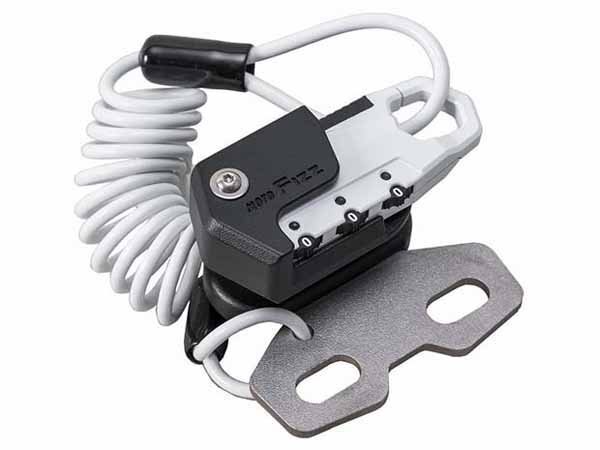 タンクに近い位置のハンドルクランプに取り付け出来るヘルメットワイヤーロック。