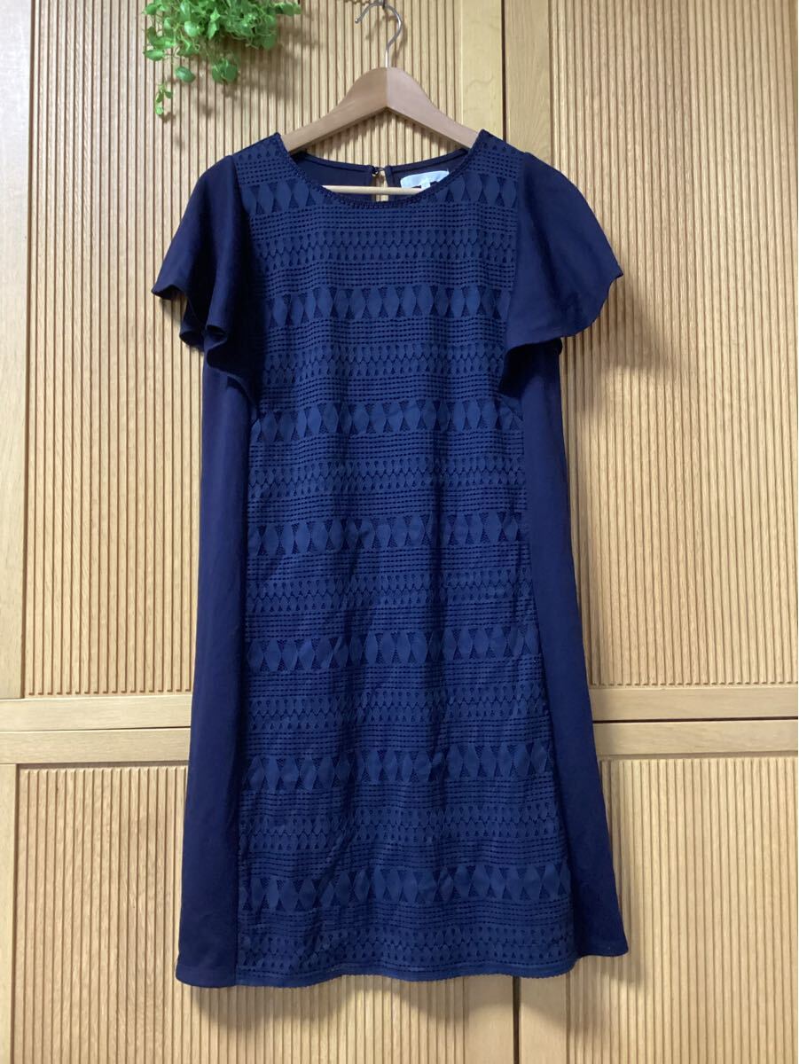 > 美品 grove 半袖フレアスリーブ ワンピース レース模様 ネイビー 紺 Lサイズ ブランドワールドチュニックワンピースゆったりフォーマル