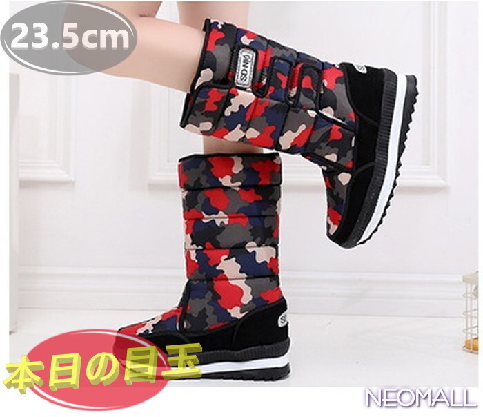 - レディース スノーシューズ 【867】 23.5cm 迷彩レッド ムートンブーツ スニーカー ウィンターブーツ 裏起毛 防水 防寒 防滑 冬用靴 綿靴