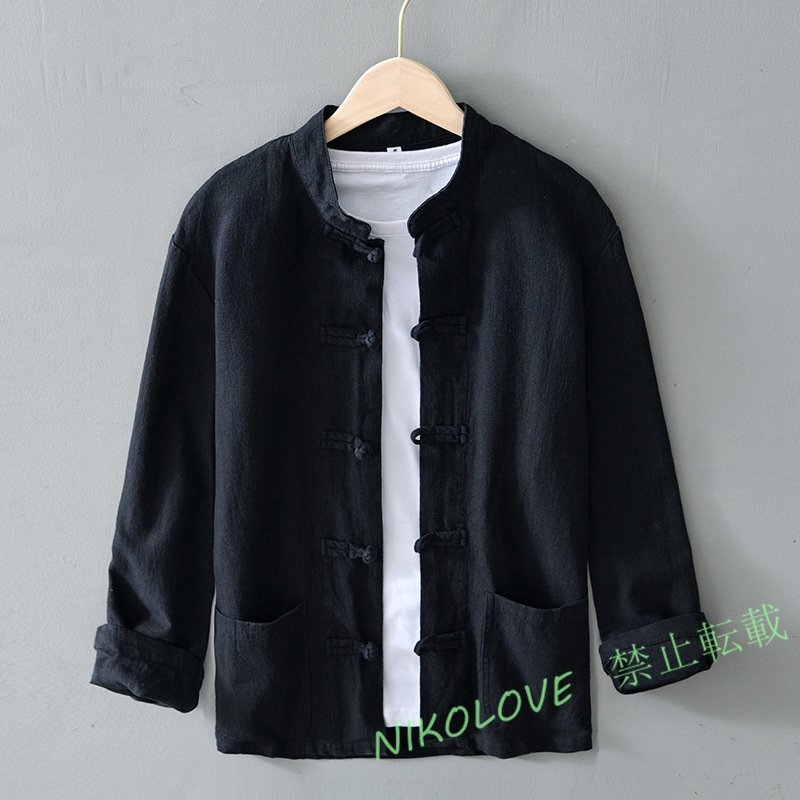 > ☆新品夏秋 メンズジャケット リネン カーディガン 長袖シャツ 綿麻 スタンドカラー 上質 レトロ 立襟 カジュアル 五色選択 ブラック M