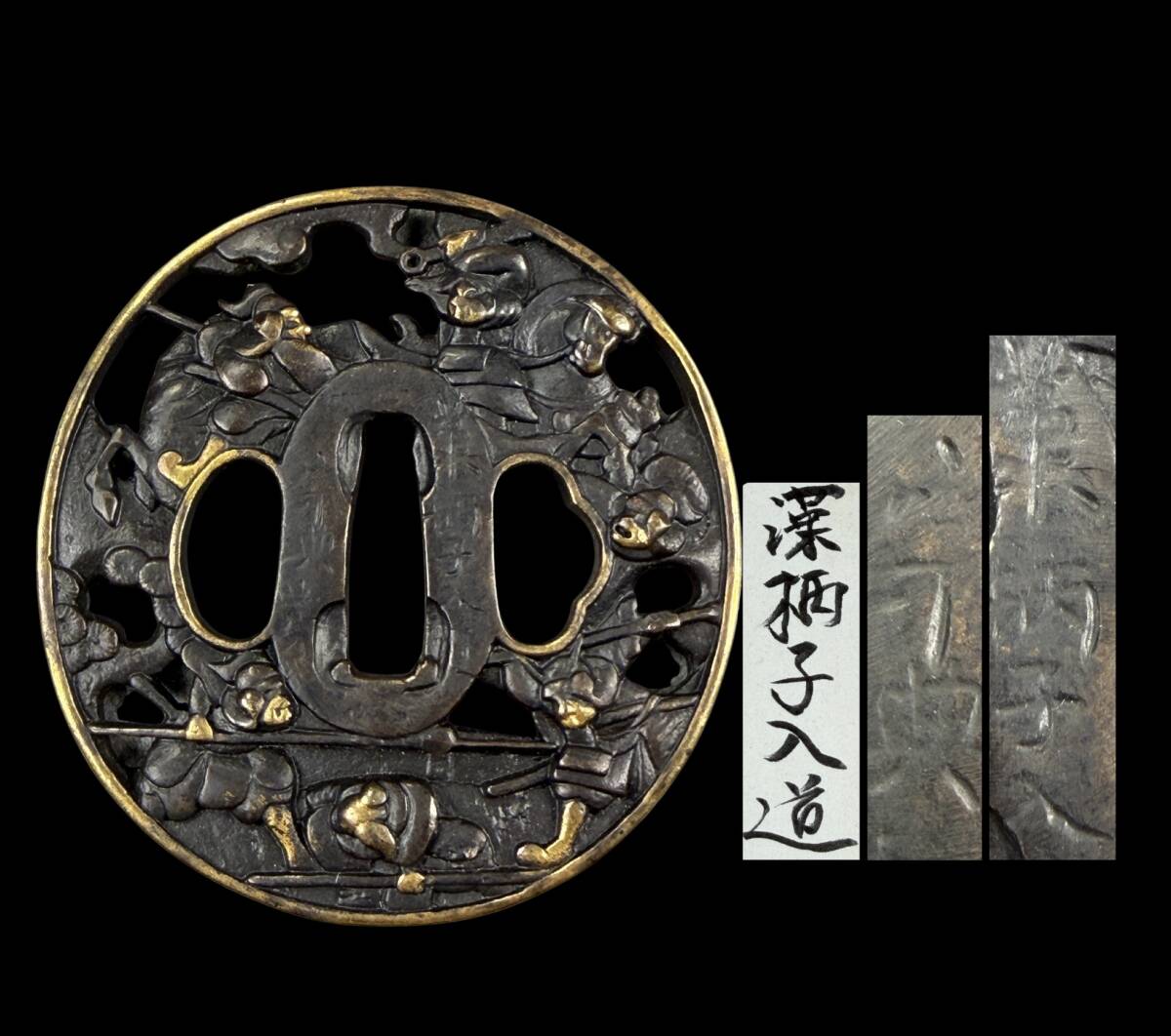 - 【偲】深栖子入道 銅地透鐔 細工 鍔 つば 居合用 日本刀装具 在銘 直径約7cm 重さ約111.65g r-981