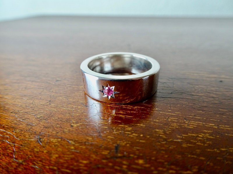 - 仁尾彫金『一つ星2.5mmピンクスピネル、幅7mm、プラチナ平打リング』ハンドメイド268