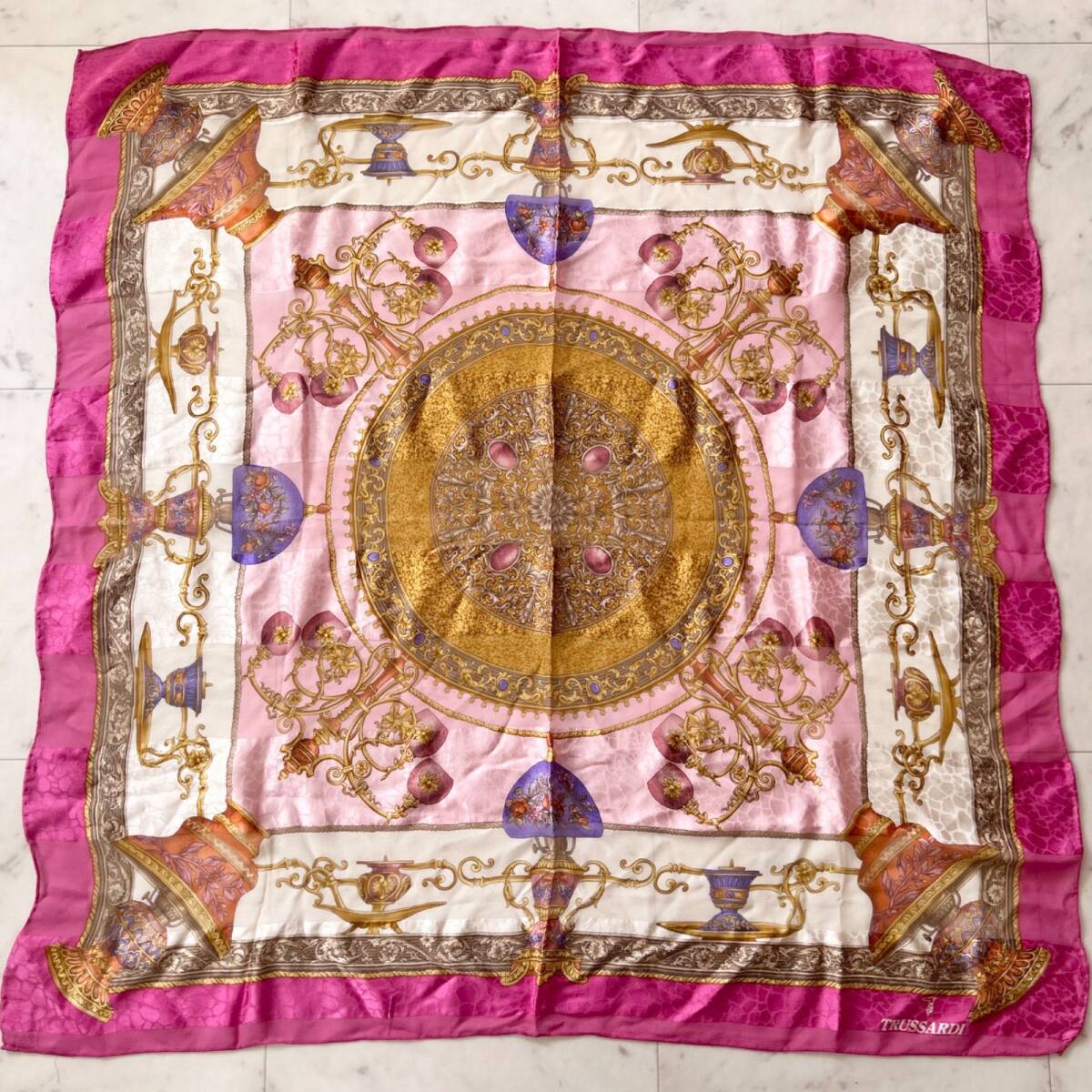 - TRUSSARDI トラサルディ 大判スカーフ シルク100 ピンク系 透け感 シアー生地 エレガント柄