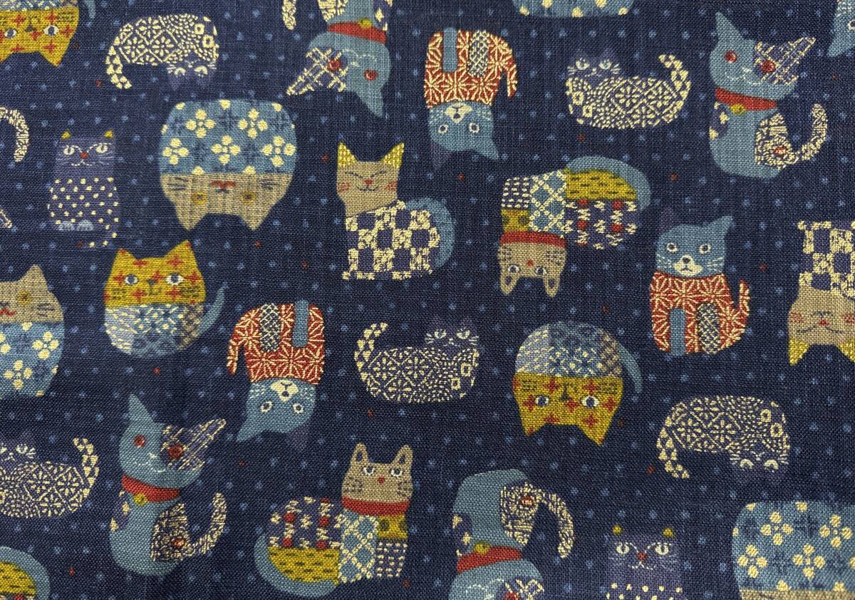 > 5m ムラ糸クロス 107×500cm 猫 綿100% 濃紺 金ラメ / 生地 はぎれ 日本製 和柄 和調 和風 むら糸 小紋 WAGARA