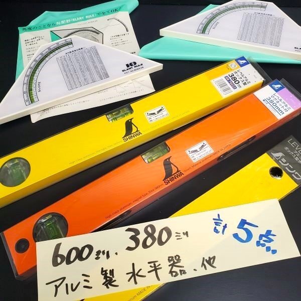- 【アウトレット品】 シンワ 他 アルミ製 水平器 勾配計 600㎜ 380㎜2種 計5点セット 測定器 レベル 配管工事 鉄工 建築 sp-032-542